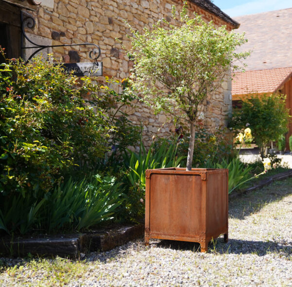 Un bac à plantes carré en Corten® au style industriel affirmé, graphique et robuste. Cette version avec pieds et rivets, en une seule partie, assemblée en atelier est idéale pour vos aménagements extérieurs pour apporter un style sobre et élégant. Dimensions totales : 50 x 50 x 60cm